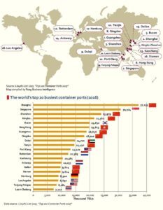 - The majority of most container-based trafficked ports are Chinese, and this fact is connected to the size reached from Chinese economy, for the moment second to USA in the world but in an overpassing mode in the next future. By the way in the first 100 container sea ports only Gioia Tauro with about 2,7 million TEU and Genoa with about 2,2 million TEU appear for Italy.