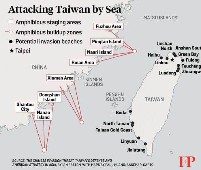 As from the maps, the island is very rocky and the possible beaches of dis-embarkment are on the south, opposite side of possible invasion direction. 3 million people can be mobilised to fight against enemies and are constantly trained for. only possibility for China is to bomb and destroy everything from the sky, but with horrible results in reputation for a country always talking of peace and world market free and opened.
